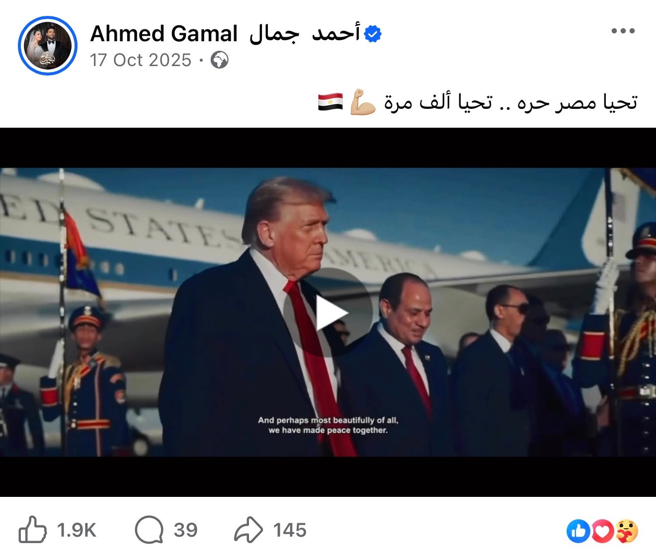 وعن اللقطات التي رصدت استقبال السيسي لترامب في الفيديو، فهي حقيقية وصورت قبل فيديو الأغنية بأيام، وكانت لاستقبال الرئيس المصري لنظيره الأمريكي، لدى وصوله للمشاركة في قمة شرم الشيخ للسلام في 13 أكتوبر 2025.
