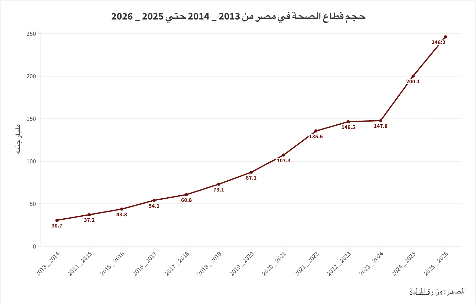 وتتوزع موازنة قطاع الصحة على النحو التالي: الأجور وتعويضات العاملين، وشراء السلع والخدمات، والدعم والمنح والمزايا الاجتماعية والاستثمار، وفوائد. ويوضح ذلك الرسم التوضيحي التالي المُعد من بيانات الموازنة العامة حجم موازنة قطاع الصحة منذ 2013 ـ 2014 حتى 2025 ـ 2026.