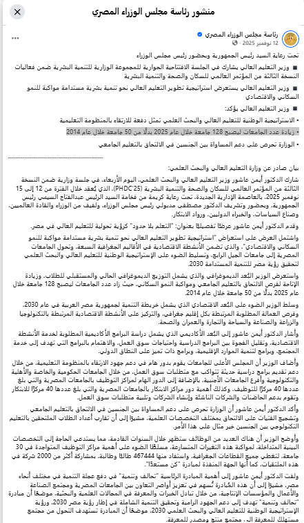 وعن عدد الجامعات أوضح الدكتور أيمن عاشور وزير التعليم العالي والبحث العلمي، في أكثر من بيان نُشر على صفحة رئاسة مجلس الوزراء في فيسبوك، أن عدد الجامعات زاد ليصبح 128 جامعة خلال عام 2025 بدلًا من 50 جامعة خلال عام 2014، وليس 45 جامعة كما يقول وزير الصحة.
