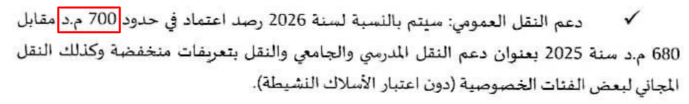أمّا النفقات المخصّصة لدعم النقل، فمن المنتظر أن تبلغ فعلا 700 مليون دينار من إجمالي نفقات الدعم المقررة لسنة 2026 وفقا لذات المصدر.