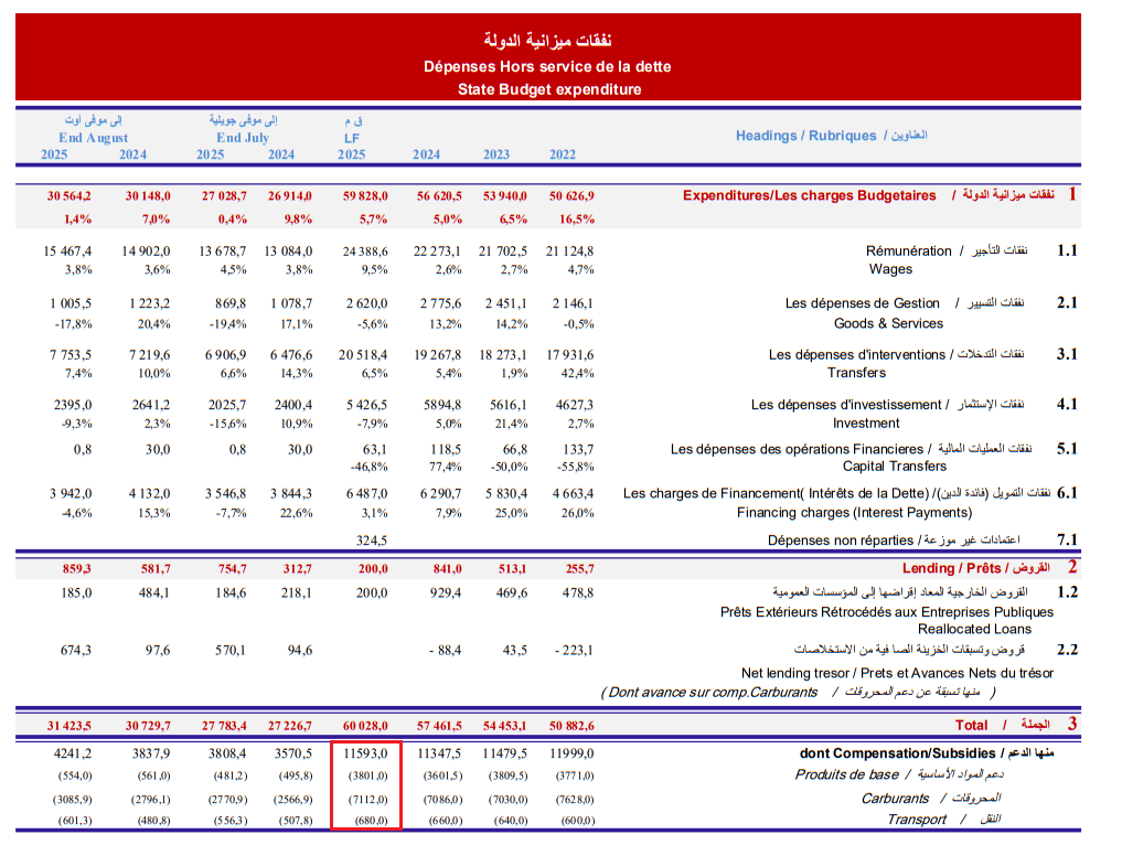 ووفقا لذات المصدر، بلغت نفقات الدعم المنجزة حتى أغسطس 2025 إجمالي 4241,2 مليون دينارا، من ضمنها 3085,9 مليون دينارا تمّ توجيهها لدعم المحروقات، و554 مليون دينارا للمواد الأساسيّة، و601.3 مليون دينار للنقل.