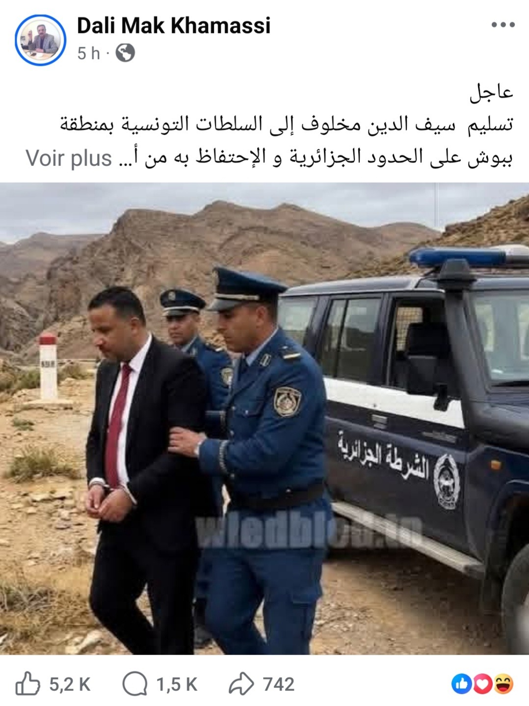 بالصور.. تسليم سيف الدين مخلوف إلى السلطات التونسية بمنطقة ببوش على الحدود الجزائرية، والاحتفاظ به من أجل أحكام صادرة في حقه.
