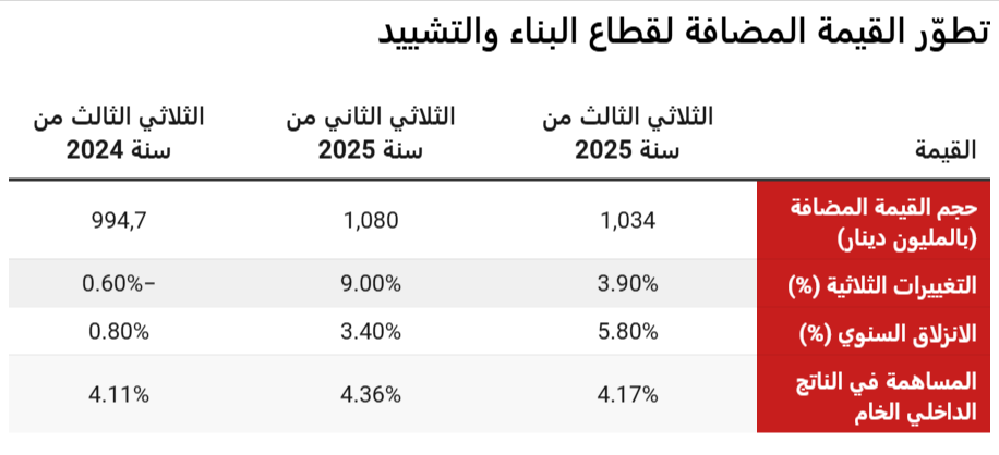 وبدوره، شهد قطاع البناء والتشييد تراجعا في حجم قيمته المضافة بـ4.3% خلال الثلاثي الثالث من سنة 2025 باحتساب التغييرات الثلاثيّة، حيثُ بلغ 1034 مليون دينارا مقارنة بـ1080 مليون دينارا تمّ تسجيلها خلال الثلاثي الثاني من ذات السنة، وذلك وفقا لبيانات ذات المصدر.