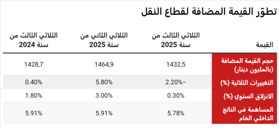 وفي ذات السياق، شهد قطاع النقل تراجعا في حجم قيمته المضافة 2.2% باحتساب التغييرات الثلاثيّة، فيما ارتفع 0.3% باحتساب الانزلاق السنوي، حيثُ بلغ 1432.5 مليون دينارا في الثلاثي الثالث من 2025، مقارنة بـ1464.8 مليون دينارا تمّ تسجيلها خلال الثلاثي الثاني، و1428,7 مليون دينارا تمّ تسجيلها في الثلاثي الثالث من 2024، وفقا لبيانات ذات المصدر.