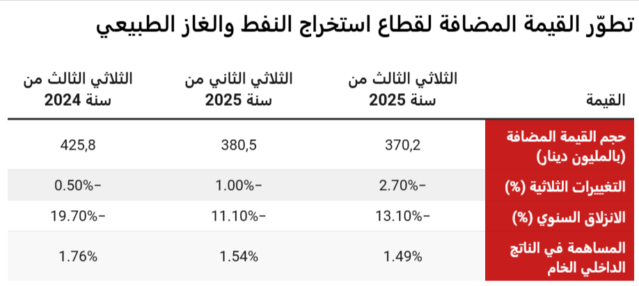 وسجّل حجم القيمة المضافة لقطاع استخراج النفط والغاز تراجعا 2.7% على أساس ثلاثي، و13.1% باحتساب الانزلاق السنوي، حيثُ بلغ 370.2 مليون دينارا في الثلاثي الثالث من 2025 مقارنة بـ380.5 مليون دينارا تمّ تسجيلها خلال الثلاثي السابق له، و425.8 مليون دينارا تمّ تسجيلها في الثلاثي الثالث من 2024 وفقا لبيانات الإحصاء.