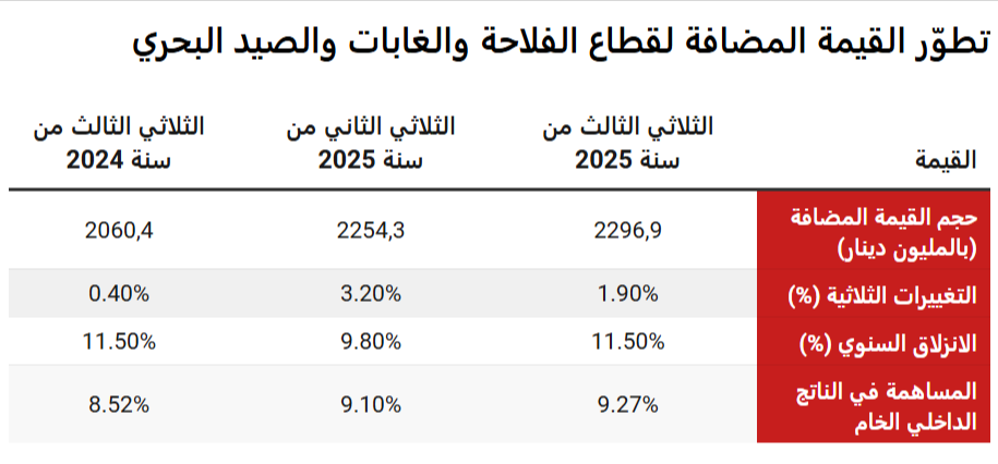 وشهد قطاع الفلاحة والغابات والصيد البحري ارتفاعا في حجم قيمته المضافة 1.9% خلال الثلاثي الثالث من سنة 2025 باحتساب التغييرات الثلاثيّة، حيثُ بلغ 2296.9 مليون دينارا مقارنة بـ2254.3 مليون دينارا تمّ تسجيلها خلال الثلاثي الثاني من ذات السنة، وفقا لبيانات ذات المصدر.