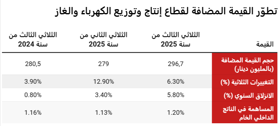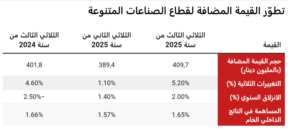 وسجّل حجم القيمة المضافة للقطاعات المتنوعة ارتفاعا 5.2% على أساس ثلاثي، و2% باحتساب الانزلاق السنوي، حيثُ بلغ 409.7 ملايين دينار في الثلاثي الثالث من سنة 2025، مقارنة بـ389.4 مليون دينارا خلال الثلاثي السابق له، و401.8 مليون دينار تمّ تسجيلها في الثلاثي الثالث من 2024، وفقا لبيانات الإحصاء.