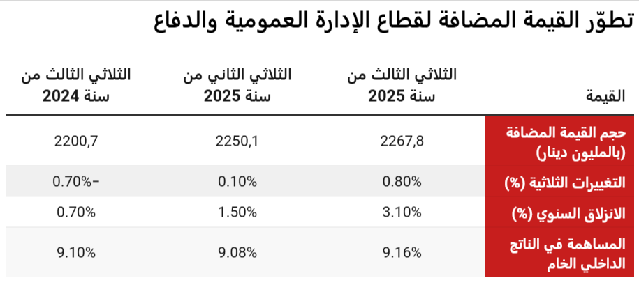 وسجّل حجم القيمة المضافة لقطاع الإدارة العموميّة والدفاع ارتفاعا 6.3% على أساس ثلاثي، و5.8% باحتساب الانزلاق السنوي، حيثُ بلغ 296.7 مليون دينارا في الثلاثي الثالث من 2025 مقارنة بـ279 مليون دينارا بالثلاثي السابق له، و280.5 مليون دينارا بالثلاثي الثالث من 2024، وفقا لبيانات الإحصاء.