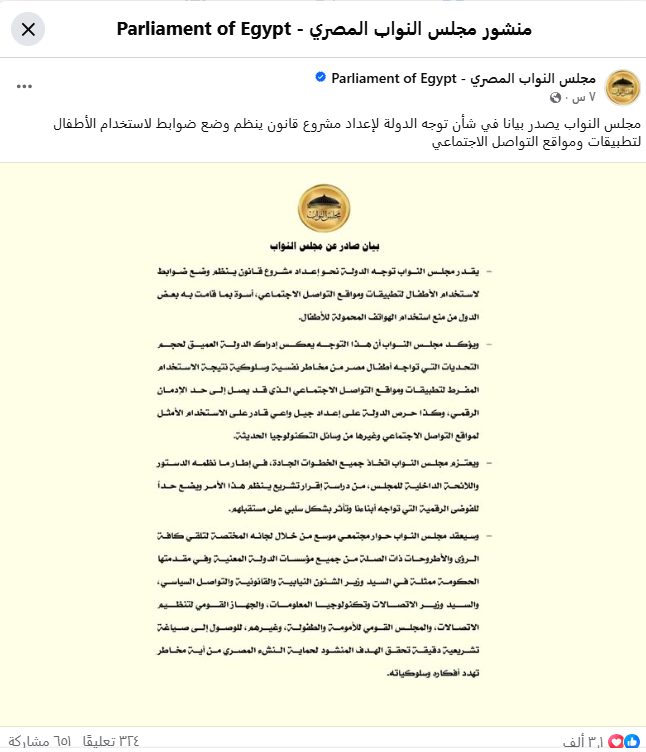وفقًا لبيان مجلس النواب الصادر في 25 يناير 2026، يقدر المجلس توجه الدولة نحو إعداد مشروع قانون ينظم وضع ضوابط لاستخدام الأطفال لتطبيقات ومواقع التواصل الاجتماعي، أسوة بما قامت به بعض الدول.