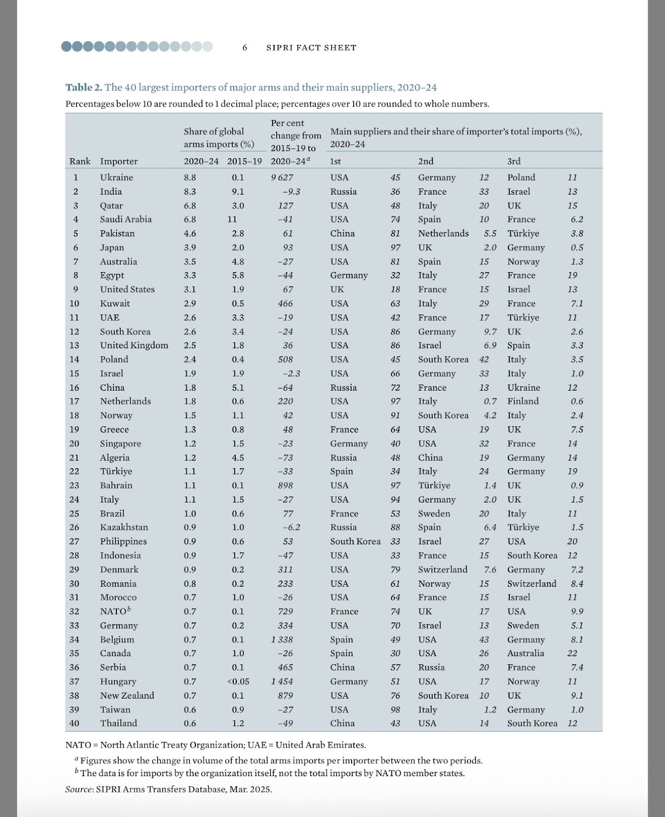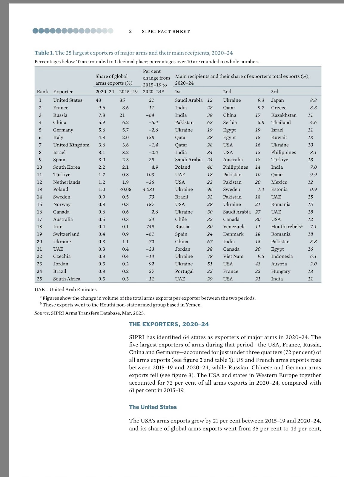 ووفقًا لمعهد ستوكهولم الدولي لأبحاث السلام (SIPRI) وهو مؤسسة بحثية دولية معروفة جدًا في مجال دراسات السلام، التسلح، ونقل الأسلحة، له مصداقية عالية جدًا في الأوساط الأكاديمية والسياسية، يمكنا من الحصول على بيانات عالمية موثوقة عن الأسلحة والإنفاق العسكري ونقل الأسلحة، مصر ليست من أكثر 20 دولة مصدرة للسلاح، بل كانت ضمن أكبر 10 دول مستوردة للأسلحة عالميًا في الفترة 2020–2024، بحصة نحو 3.3 % من واردات الأسلحة العالمية، وتأتي في الترتيب الـ8 عالميًا بين الدول المستوردة.