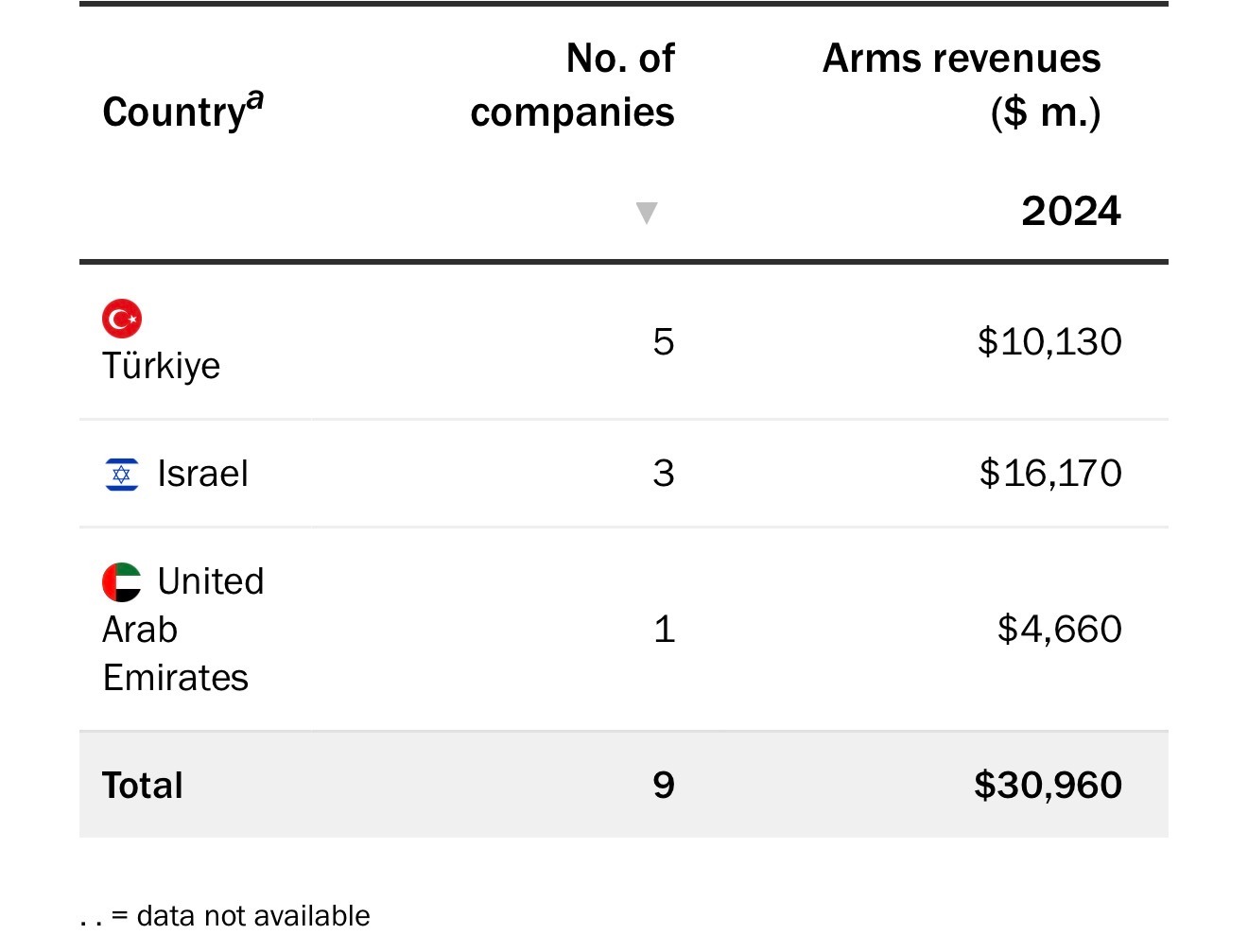 عمقنا البحث أكثر في قائمة أكثر الشركات انتاجًا للسلاح فلم تظهر شركات مصرية ضمن قائمة أفضل 100 شركة منتجة للأسلحة والخدمات العسكرية في العالم في عام 2024، وفقًا للمصدر السابق ذكره، بينما لم تظهر ضمنهم دول عربية غير الإمارات، وظهرت شركات من إسرائيل وهي ليست عربية ولكن إقليميا موجودة في الشرق الأوسط، وتركيا والتي تعتبر أحيانا معيارا مهما للمقارنة على الرغم من أنها ليست عربية.