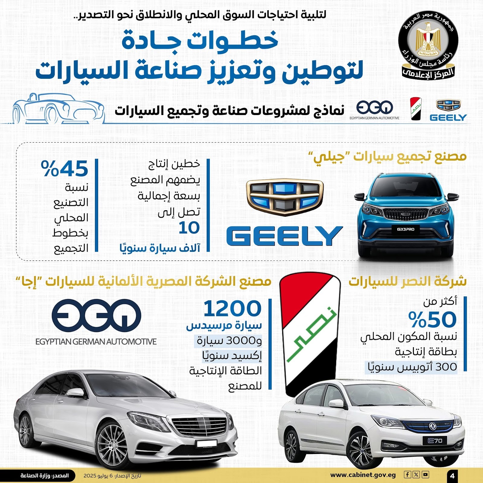 وأظهر بيان لمجلس الوزراء المصري في 6 يوليو 2025، أن نسبة التجميع في بعض مصانع السيارات في مصر وصلت إلى 45% في مصنع "جيلي" و50% في شركة النصر للسيارات.