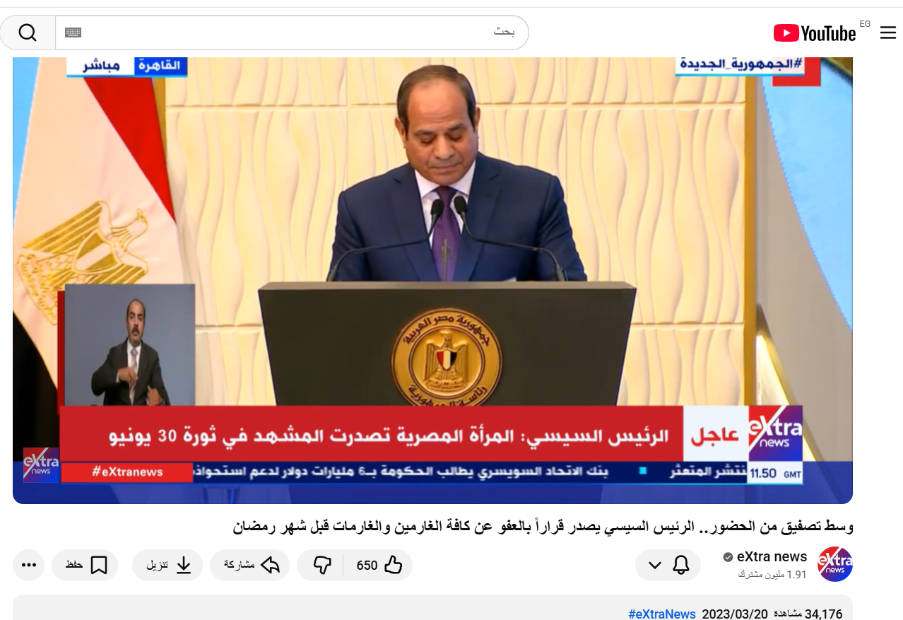 بحثنا عكسيًا عن الفيديو، فوجدنا أنه لكلمة للرئيس المصري في 20 مارس 2023، حيث أصدر وقتها قرارا بالعفو الرئاسي عن كافة الغارمين والغارمات ممن يقضون عقوبات بمراكز الإصلاح والتأهيل والإفراج عنهم قبل حلول شهر رمضان.