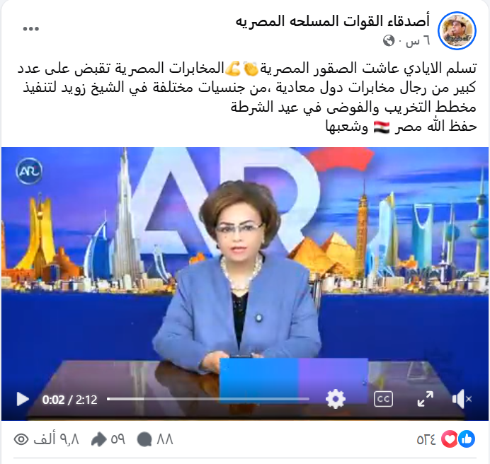 فيديو لمذيعة كويتية بعنوان: المخابرات المصرية تقبض على عدد كبير من رجال مخابرات دول معادية، من جنسيات مختلفة في الشيخ زويد لتنفيذ مخطط التخريب والفوضى في عيد الشرطة.