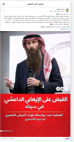 وبمزيد من البحث وجدنا أن الأنباء متداولة منذ 14 يناير 2026، ونقلها أيضًا الصحفي طارق مرتضى، الإعلامي ببرنامج "جورنالجي"، ليتنقالها بعد ذلك عدد من الحسابات بتصميم لـ"شبكة رصد"، ومكتوب عليه "القبض على الإرهابي الداعشي في سيناء أبو جيم الأنصاري، والعملية تمت بواسطة قوات الجيش المصري".