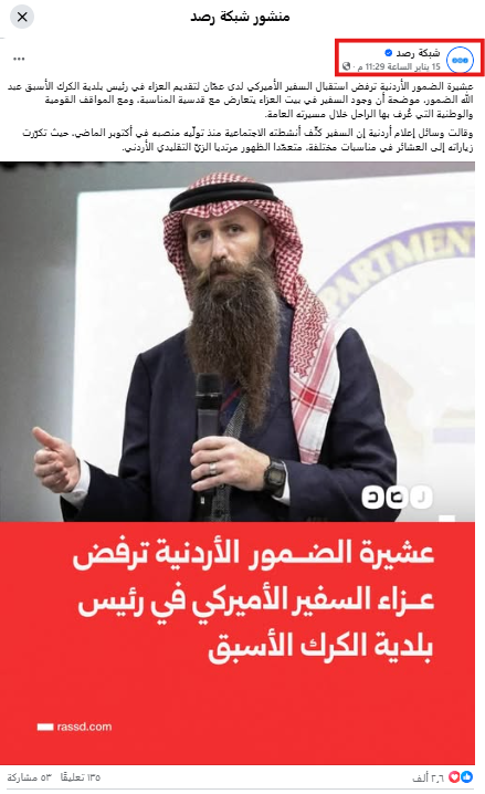 وبالبحث العكسي، وجدنا أن التصميم الأصلي نُشر على "شبكة رصد" الإخبارية في 15 يناير 2026، ومكتوب عليه: "عشيرة الضمور الأردنية ترفض عزاء السفير الأميركي في رئيس بلدية الكرك الأسبق".