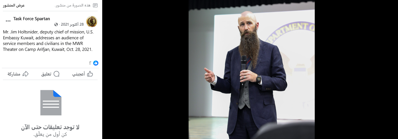 وبالبحث لم نجد تلك الصورة، فهي "معدلة"، وترجع إلى جيمس هولتسنايدر، السفير الأمريكي لدى الأردن، ولكن بدون الكوفية الحمراء التي يرتديها، ونُشرت في الحساب الرسمي لصفحة قوة الدفاع سبارتان في 28 أكتوبر 2021، وكان آنذاك نائب رئيس البعثة في سفارة الولايات المتحدة بالكويت.