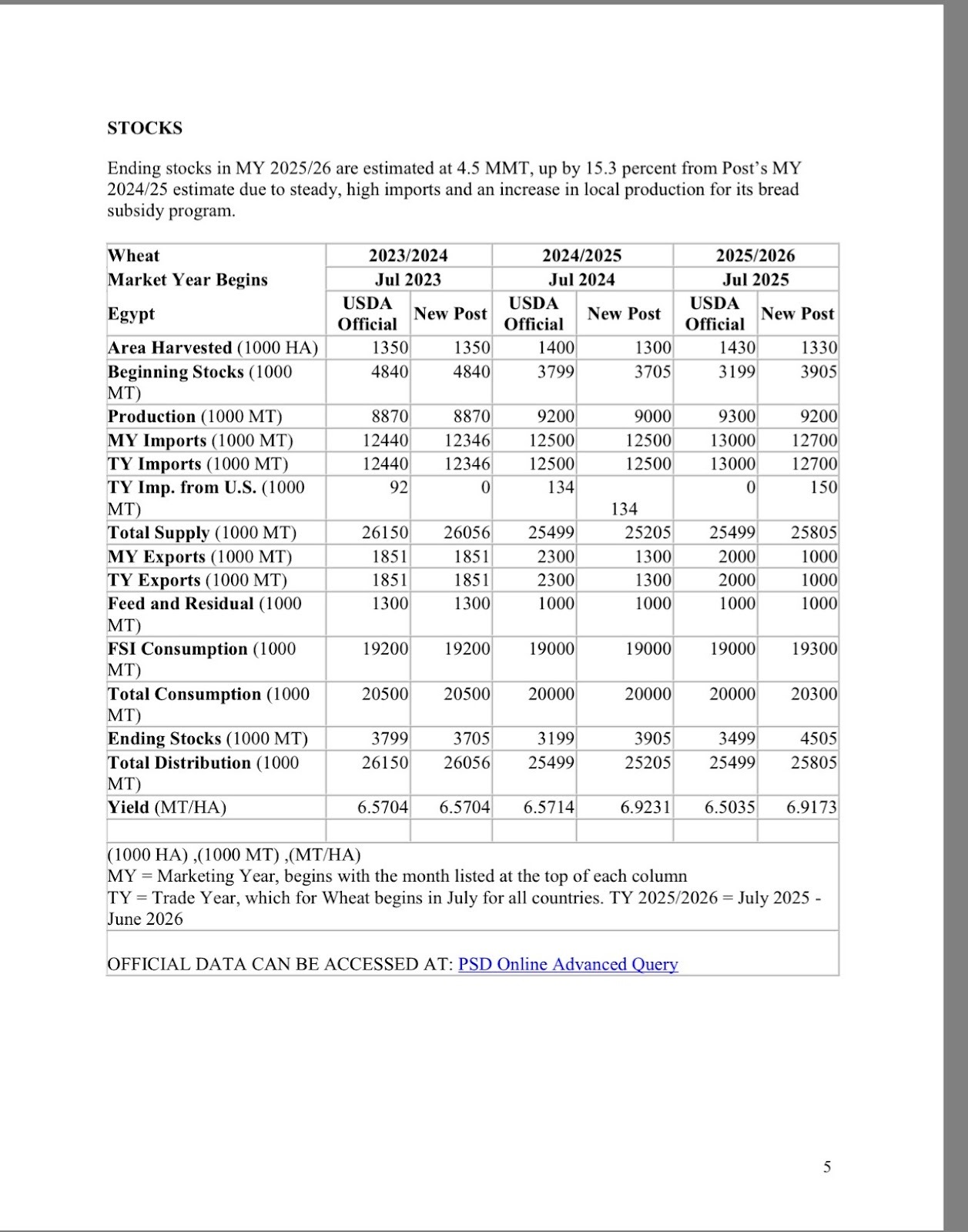 وتتوقع وزارة الزراعة الأمريكية أن تستورد مصر 12.7 مليون طنًا قمح في 2025 - 2026، وفقا لأحدث تقرير للحبوب والأعلاف الصادر عنها في 22 سبتمبر 2025.