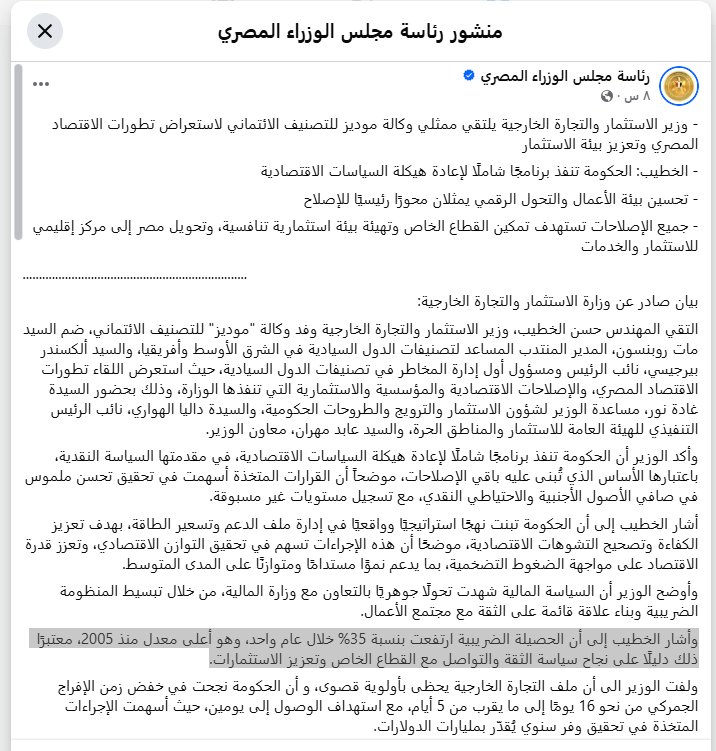 الحصيلة الضريبية ارتفعت بنسبة 35% خلال عام واحد، وهو أعلى معدل منذ 2005، وهو دليل على نجاح سياسة الثقة والتواصل مع القطاع الخاص وتعزيز الاستثمارات.