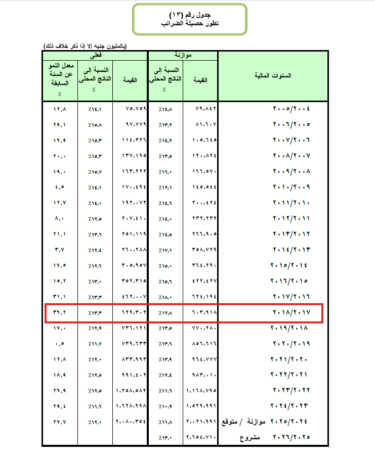 وبالرجوع إلى بيانات الموازنة العامة للدولة المنشورة في موقع وزارة المالية، سجل العام المالي 2017 ــ 2018 زيادة في الحصيلة الضريبية نسبة 36.2%، مقابل العام المالي 2016 ـ 2017 زادت 31.1%، وبالتالي لم تكن نسبة العام المالي 2024 ـ 2025 هي الأعلى منذ 2005.