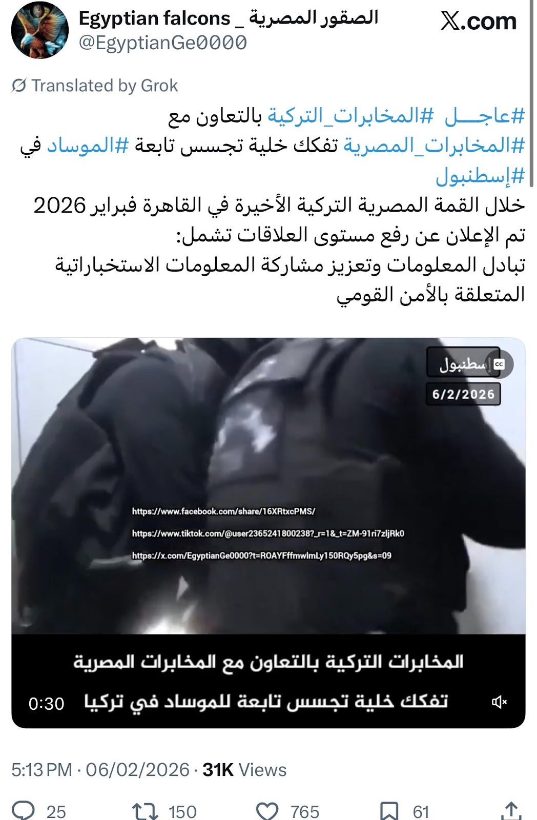 المخابرات التركية بالتعاون مع المخابرات المصرية تفكك خلية تجسس تابعة للموساد في إسطنبول، خلال القمة المصرية التركية الأخيرة في القاهرة فبراير 2026، وتم الإعلان عن رفع مستوى العلاقات لتشمل تبادل المعلومات وتعزيز مشاركة المعلومات الاستخباراتية المتعلقة بالأمن القومي.