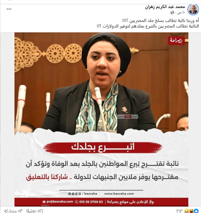 الادعاء "مضلل"، حيث شوهت المنشورات على مواقع التواصل الاجتماعي اقتراح النائبة أميرة صابر، بتسهيل إجراءات التبرع بالأنسجة بعد الوفاة، ليضمن حق كل طفل مصري مصاب بالحروق في الحصول على العلاج المنقذ للحياة، بغض النظر عن قدرة أسرته المالية، حيث تصل لـ"مليون جنيه" للحالة الواحدة، كما يوفر على الدولة الملايين سنوياً من تكاليف الاستيراد.