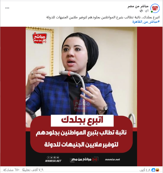في بداية البحث وجدنا أن بعض الموقع ومنها "مباشر من مصر" و"بصراحة نيوز" نشرت الخبر دون تفاصيل، بعناوين "مضللة"، ومنها "اتبرع بجلدك.. نائبة تطالب بتبرع المواطنين بجلودهم لتوفير ملايين الجنيهات للدولة".