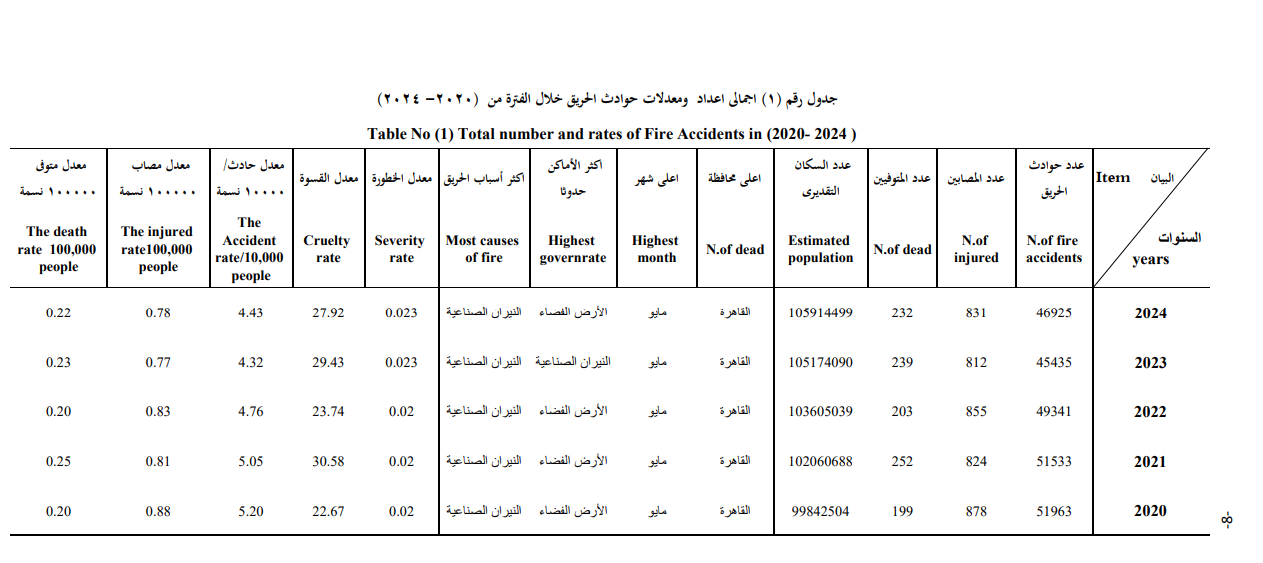 ووفقًا لبيانات الجهاز المركزي للتعبئة العامة والإحصاء، بلغ عدد المتوفين من ضحايا حوادث الحريق 232 متوفيًا عام 2024، مقابل 239 متوفيًا عام 2023، بنسبة انخفاض قدرها 2.9%، وبلغ عدد المصابين 831 مصابًا عام 2024، مقابل 812 مصابًا عام 2023، بنسبة ارتفاع قدرها 2.4%.