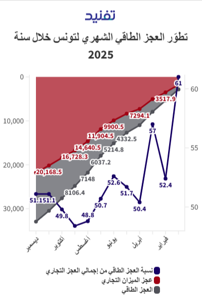 وكان العجز الطاقي قد مثّل كذلك 51.1% من العجز التجاري لتونس إلى نوفمبر 2025، حيثُ بلغت قيمته 10 آلاف و308 ملايين دينار من إجمالي 20 ألفا و168 مليون دينارا وفقا لبيانات التجارة الخارجيّة بالأسعار الجارية لشهر نوفمبر 2025، الصادرة عن المعهد الوطني للإحصاء.