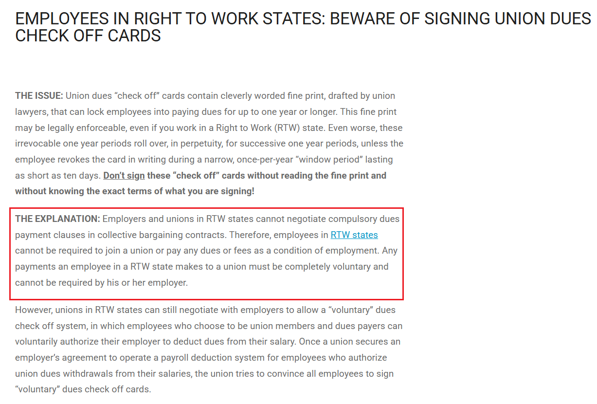 ورغم نصّ القانون الوطني لعلاقات العمل الأمريكي لسنة 1935 على جواز الاتفاق على جعل العضوية النقابيّة شرطًا للعمل مع إمكانيّة تعليقها في حال عدم دفع الرسوم الموحّدة، فإنّ التشريعات اللاحقة كقانون "Taft-Hartley Act" لسنة 1947 أدّى إلى سنّ قوانين الحق في العمل التّي حظرت إلزاميّة الانضمام للنقابات العماليّة ودفع رسوم العضويّة كشرط للتوظيف وحوّلتها إلى ممارسات طوعيّة. وقد فعّلت 26 ولاية أمريكيّة هذا القانون فيما لا تزالُ بقيّة الولايات تفرض قانون النقابات الإلزامي.