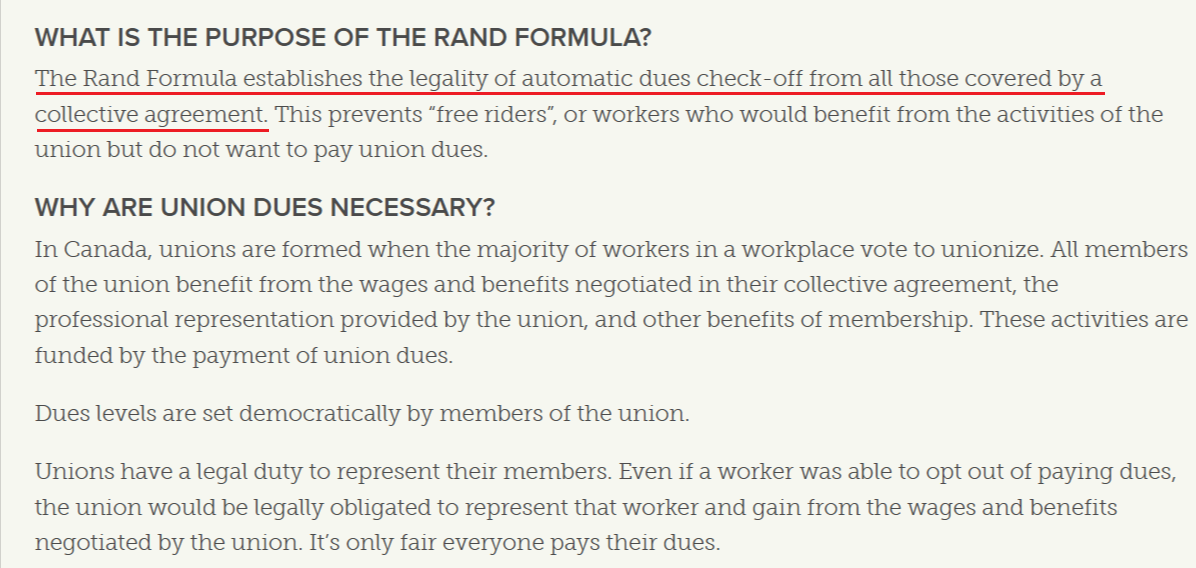 وفي كندا، تُرسّخ "صيغة راند"، وهي قرار صدر عن المحكمة العليا في سنة 1946، شرعيّة خصم أرباب العمل لرسوم العضويّة النقابية تلقائيّا من أجور العملة المشمولين بالاتفاقيات الجماعية مع النقابات المعتمدة مقابل استفادتهم من خدمات التفاوض الجماعي. ومنذ ذلك الحين، بات هذا المبدأ جزءًا من الإطار المنظم للعلاقات العمالية - النقابية في عدد من المقاطعات الكندية وفقا لما جاء في نبذة تعريفيّة نشرت على الموقع الإلكتروني للاتحاد الكندي للموظفين العموميين.