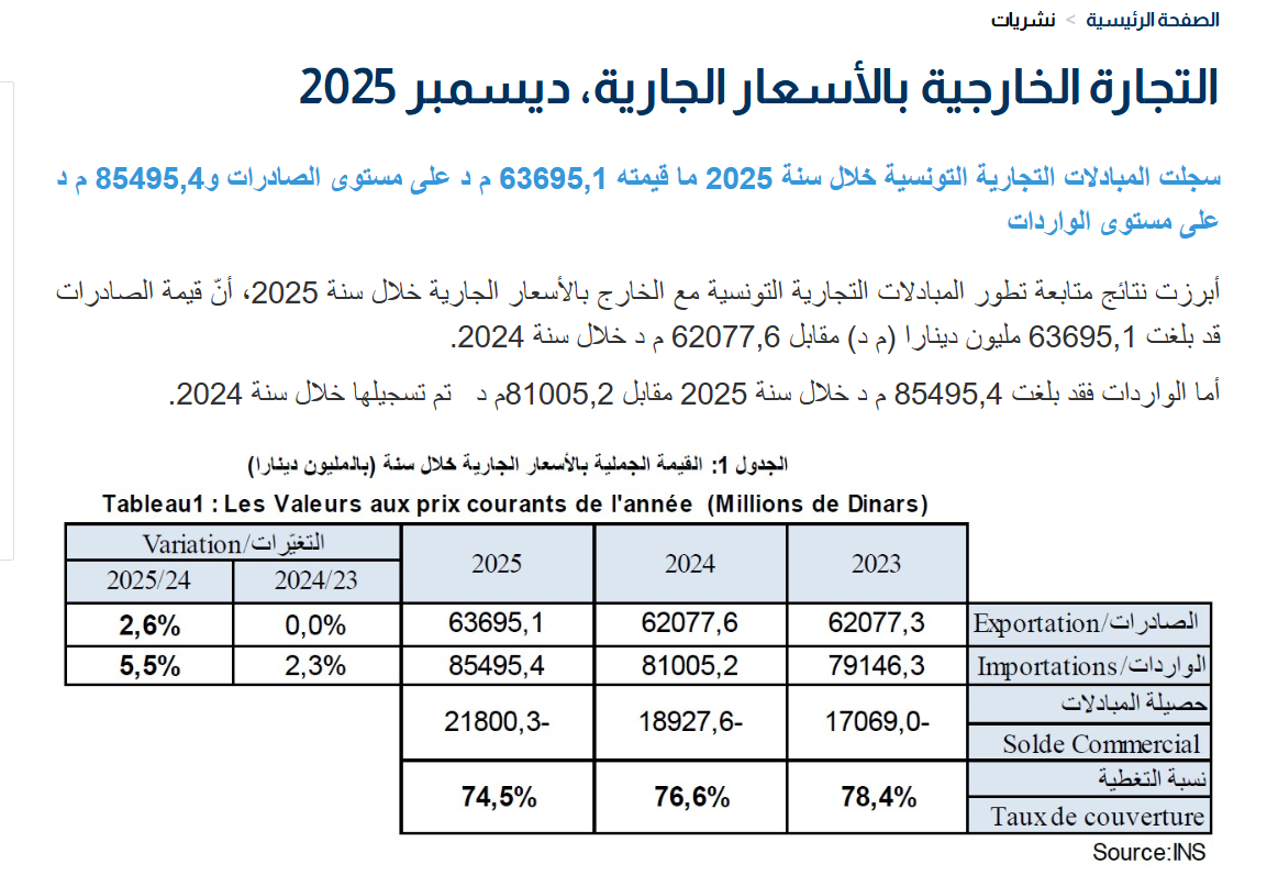 بالعودة إلى نشرة التجارة الخارجية الخاصة بكامل سنة 2025 والصادرة عن المعهد الوطني للإحصاء، وجدنا أن قيمة صادرات تونس بلغت 63695,1 مليون دينار مقابل 62077,6 مليون دينار سنة 2024 أي بنسبة تطور 2.6% وليس 39% مثل ما صرح المدعي.