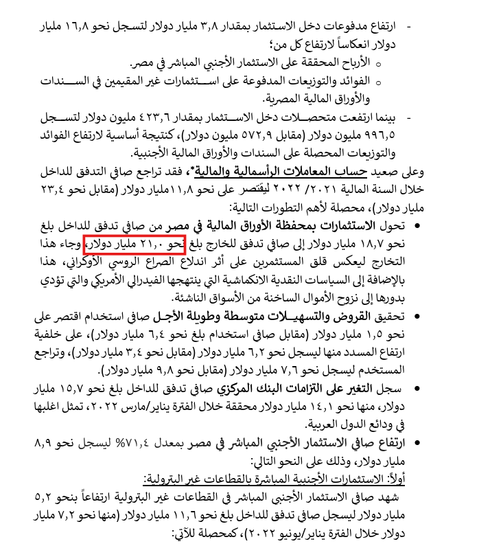ووفقًا لبيانات ميزان المدفوعات الصادرة من البنك المركزي لعام 2021 ـ 2022، بلغ صافي تدفق "الأموال الساخنة" للخارج 21 مليار دولارًا إثر قلق المستثمرين لاندلاع الصراع الروسي الأوكراني، وهو ما أكده الدكتور مصطفى مدبولي رئيس مجلس الوزراء، في 17 مايو 2023.