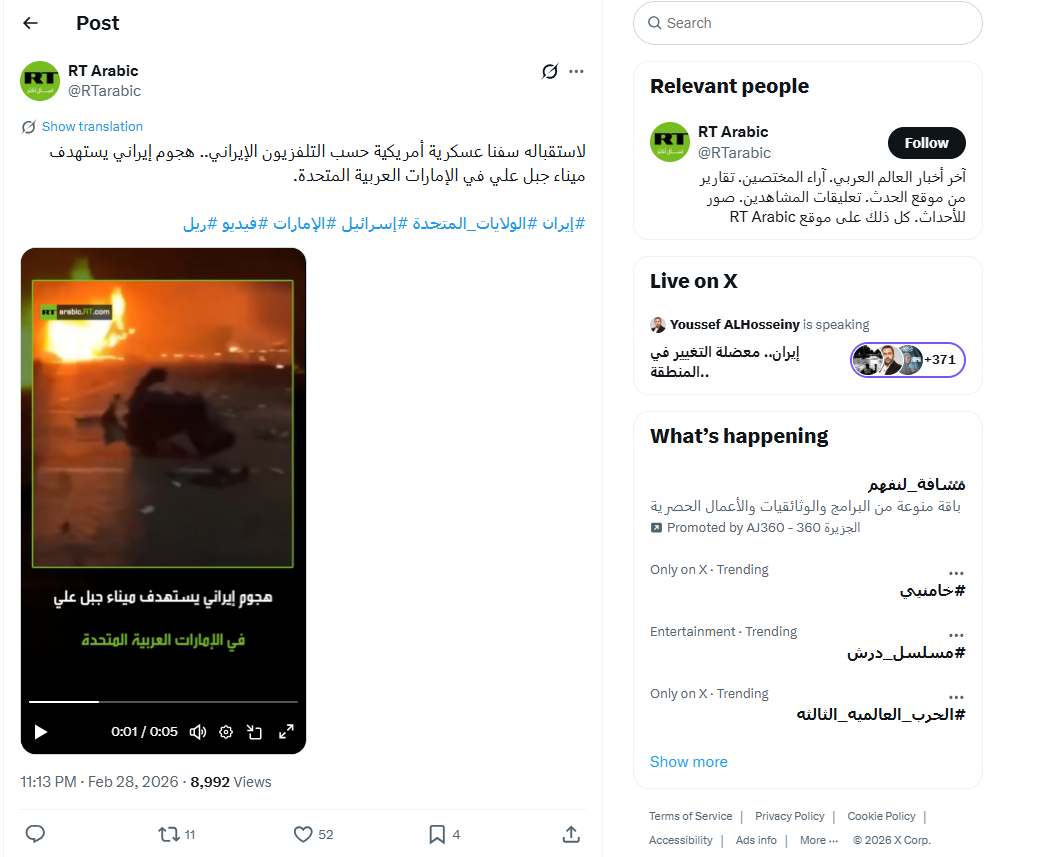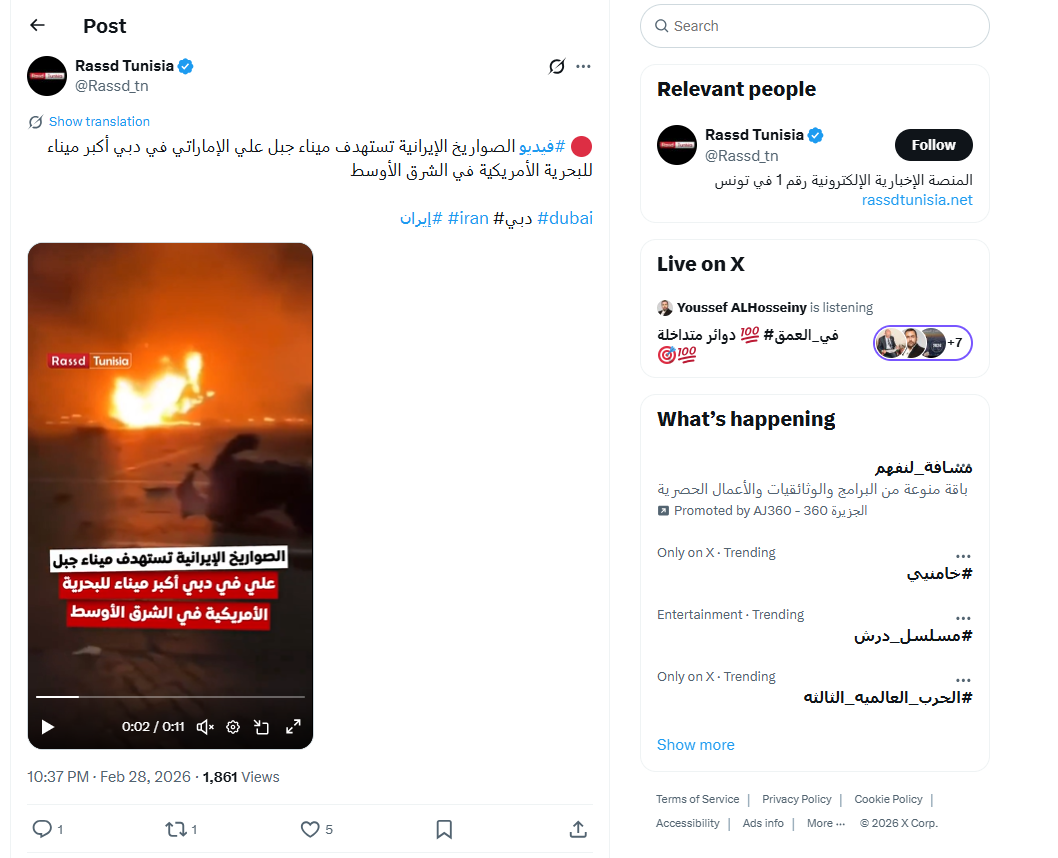 تتبع فريق "تفنيد" الأنباء المتداولة على المواقع الإخبارية، بخصوص مسيرة إيرانية تستهدف ميناء جبل علي بالإمارات، يوم 28 فبراير 2026، ووجد أنها "مضللة"، وفقًا للبحث العكسي عن الفيديو.