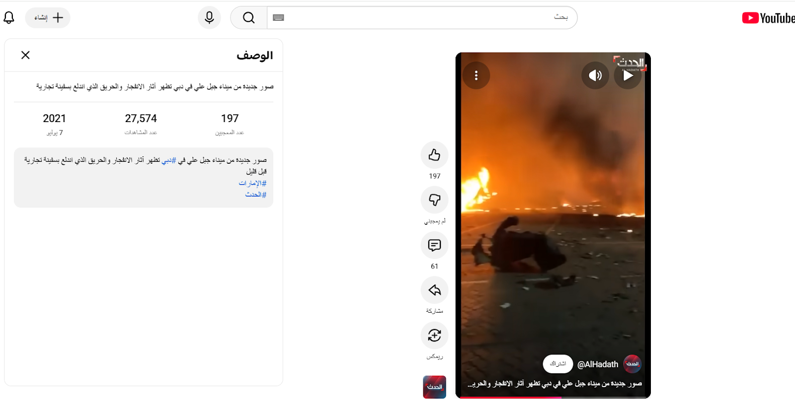 وبالبحث العكسي تبين أن الفيديو منشور في وسائل إعلامية توثق حريقًا اندلع في سفينة بميناء جبل علي في دبي في 7 يوليو 2021.