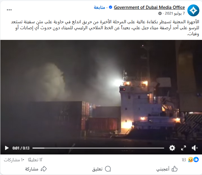 ونشر الحساب الرسمي للمكتب الإعلامي لحكومة دبي مشاهد للحريق، موضحًا اندلاعه في حاوية على متن سفينة تحمل مواد قابلة للاشتعال، كانت تستعد للرسو على أحد أرصفة ميناء جبل علي، بعيدًا عن الخط الملاحي الرئيسي للميناء، دون وقوع إصابات أو وفيات.
