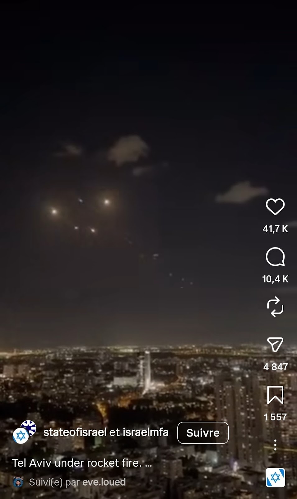 ونشر حينها الحساب الرسمي للكيان الإسرائيلي على إنستغرام الفيديو، بعنوان "تل أبيب تحت نيران الصواريخ".