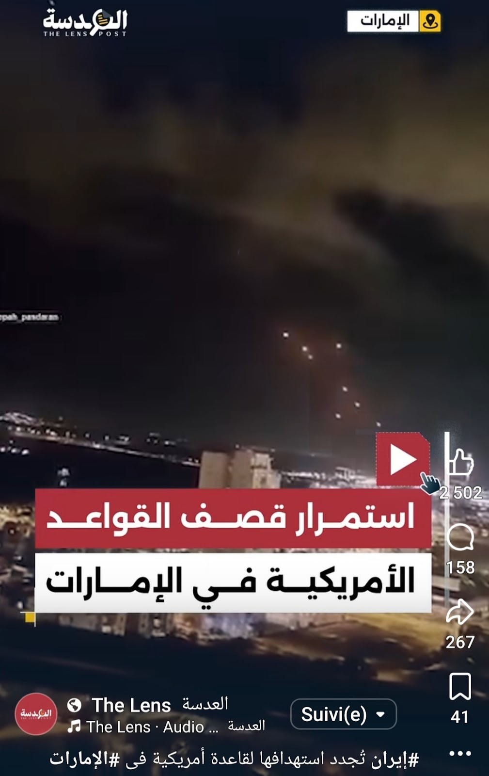 هذا الادعاء تداولته حسابات إخبارية أخرى على فيسبوك، من بينها منصة "العدسة"، التي أعادت نشره تحت عنوان مضلل يفيد باستمرار قصف القواعد الأمريكية في الإمارات.