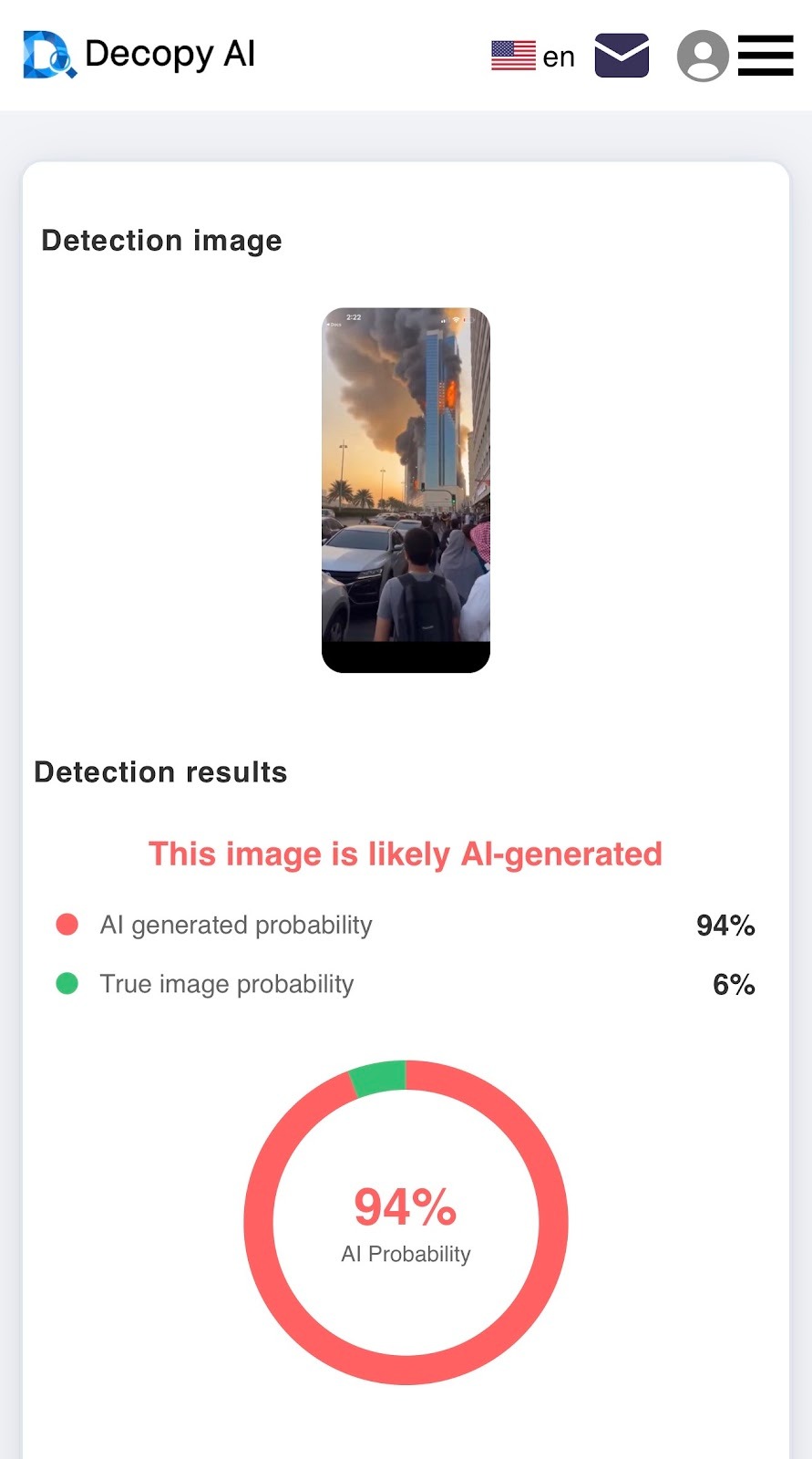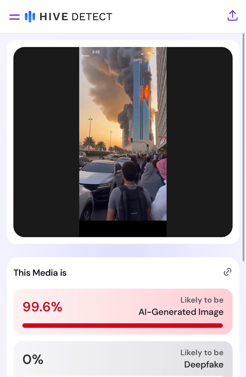 وباستخدام أداتي hive detection وDecopy لكشف زيف الصور والفيديوهات، اتضح أن الفيديو بنسبة 99% مولد بالذكاء الاصطناعي.