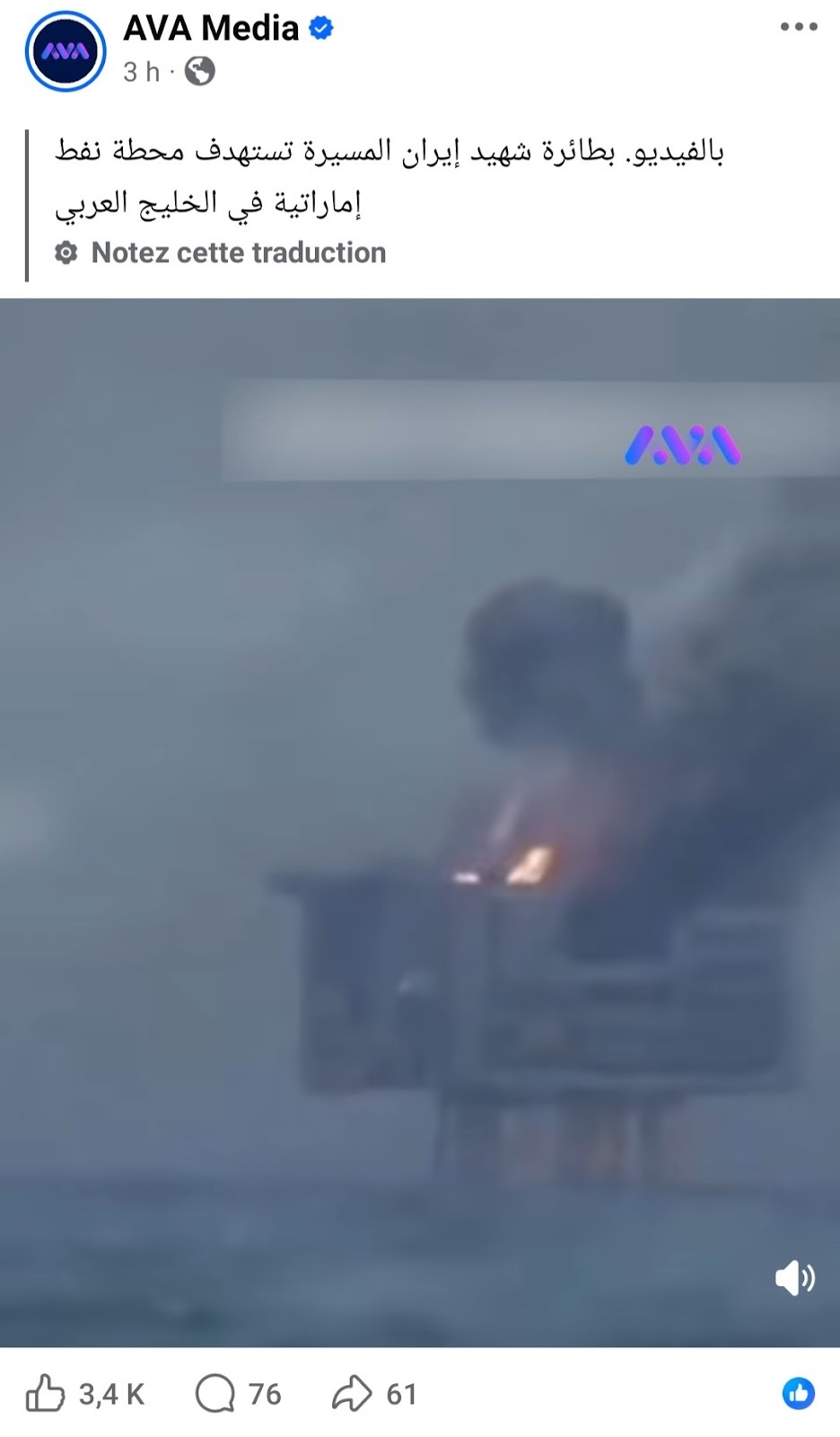 تتبع فريق “تفنيد” الفيديو الذي تداولته حسابات إخبارية على منصة فيسبوك، بتاريخ 2 مارس 2026، حول استهداف مسيرة إيرانية لمحطة نفط إماراتية في الخليج العربي، واتضح أنه “مضلل”، وذلك من خلال البحث العكسي عن الفيديو.
