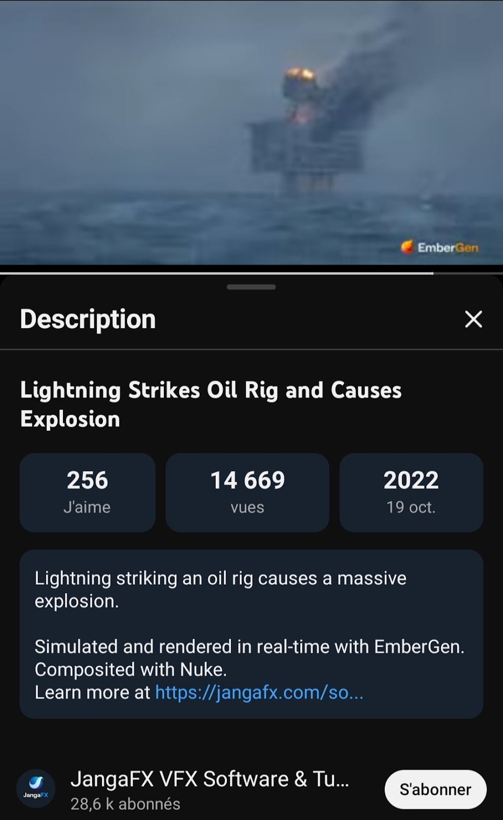 وخلال التدقيق لمعرفة سياق الادعاء لاحظنا شعار Embergen على الفيديو الأصلي، لذلك بحثنا في محتوى القناة ووجدنا في الوصف أنها شركة تطور برمجيات آنية (Real-Time) مخصّصة لفناني المؤثرات البصرية (VFX) في صناعة الألعاب والأفلام. كما تقدّم دروسًا تعليمية احترافية تشرح خطوة بخطوة كيفية تصميم وصناعة مؤثرات بصرية للألعاب، ما يبين أن الفيديو ثلاثي الأبعاد وليس حقيقي.