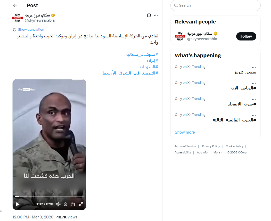 بالفيديو.. قيادي في الحركة الإسلامية السودانية يدافع عن إيران ويؤكد: الحرب واحدة والمصير واحد.