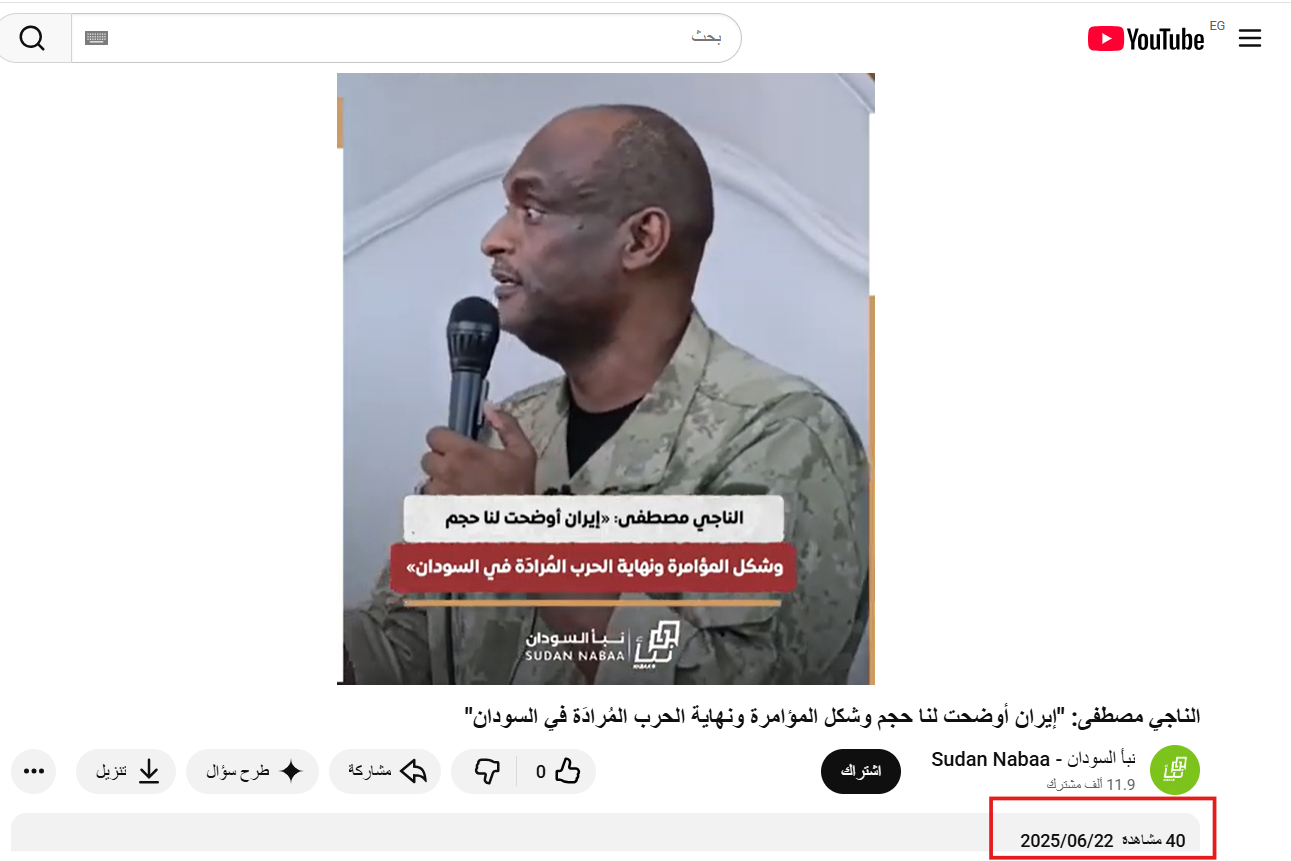 وكشف البحث العكسي أن الفيديو نشر في 22 يونيو 2025، لكلمة للدكتور ناجي مصطفى، وهو أكاديمي وقانوني واقتصادي وسياسي سوداني، والأمين السياسي لحركة مستقبل الإصلاح والتنمية، خلال خطبة في السودان.