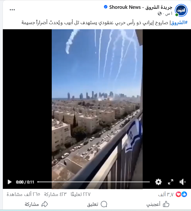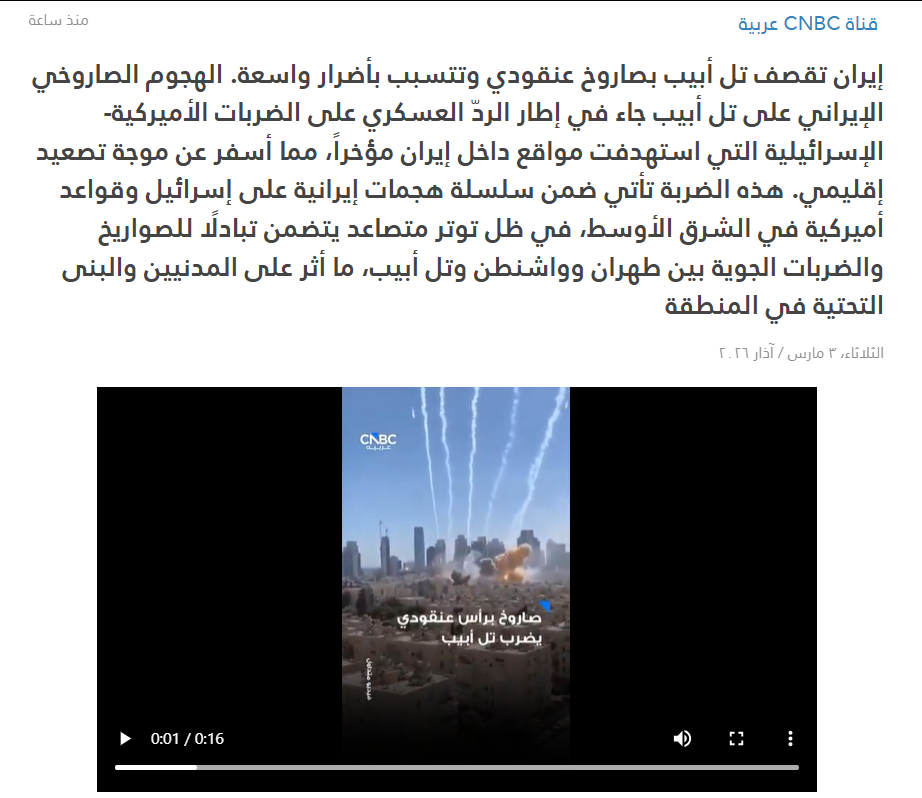 تتبع فريق "تفنيد" الأنباء المتداولة على المواقع الإخبارية، ومنها الشروق الإخبارية، وقناة CNBC عربية، وموقع تحيا مصر، بخصوص صاروخ إيراني ذو رأس حربي عنقودي يستهدف تل أبيب، يوم 3 مارس 2026، ووجد أنه "مضلل"، و"مفبرك".
