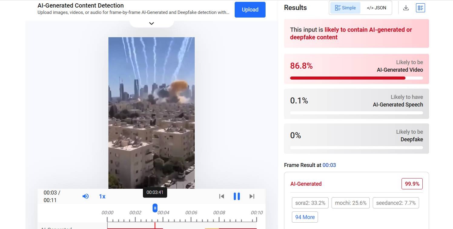 وبفحص المقطع وتحليله بصريًا، نلاحظ عدم وضوح شكل الانفجارات والأدخنة الظاهرة، حيث أظهر عدد من أدوات التحليل أن الفيديو مولد بالذكاء الاصطناعي، ومنها موقع "HIVE MODERATION".
