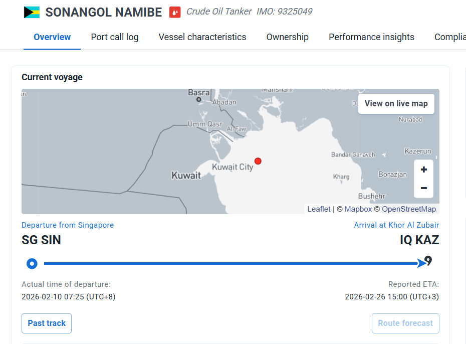 وبتعميق البحث في المياه الإقليمية بالخليج العربي من خلال موقع Marinetraffic يتضح وجود ناقلتي نفط تحمل علم البهاما الأولى هي الناقلة SONANGOL NAMIBE، بعد مغادرتها ميناء "خور الزبير" والذي وصلته في 26 فبراير 2026. وغادرته في 4 مارس 2026 في طريقها إلى الصين بحسب موقع Magic port.