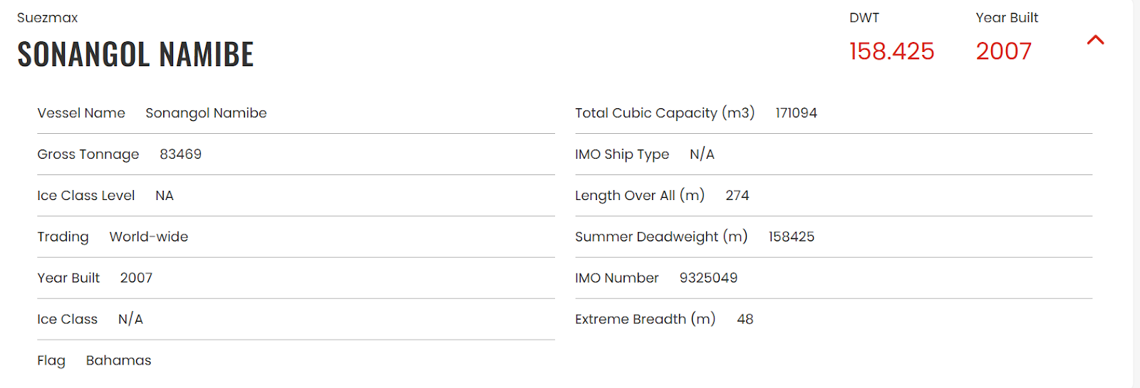 وكانت الناقلة قادمة من ميناء سنغافورة باتجاه ميناء "خور الزبير" خلال رحلتها، وهي مملوكة إلى شركة سونانغول وهى شركة النفط والغاز الطبيعي المملوكة للدولة الأنغولية، وتبلغ سعتها الإجمالية 171 ألف متر مكعب.
