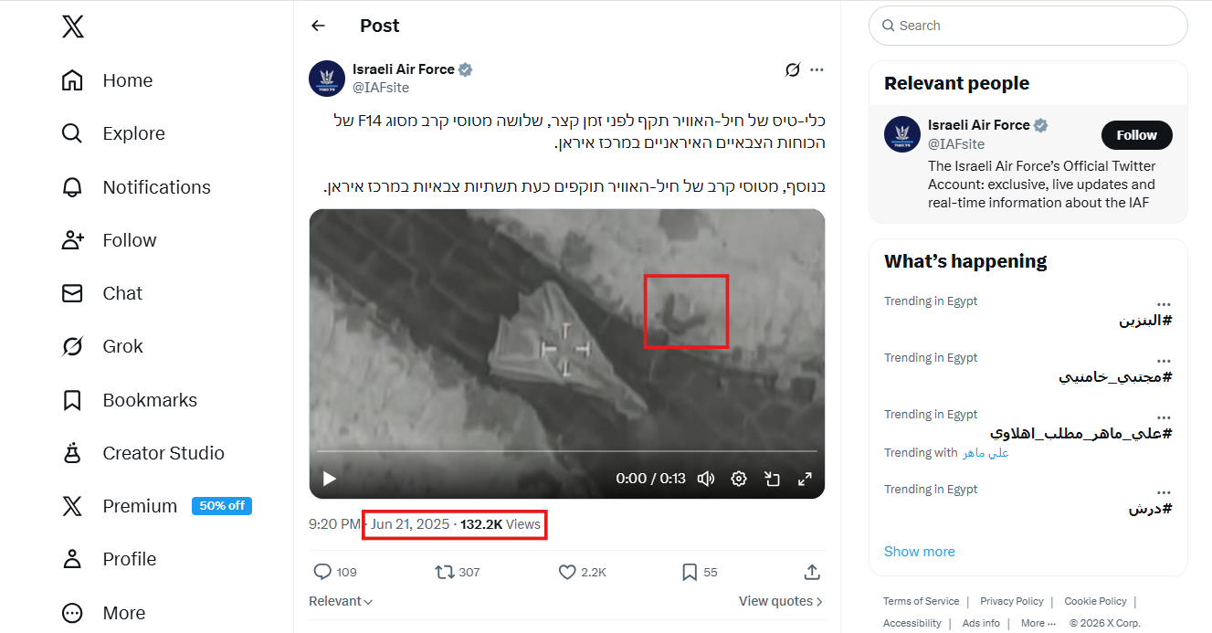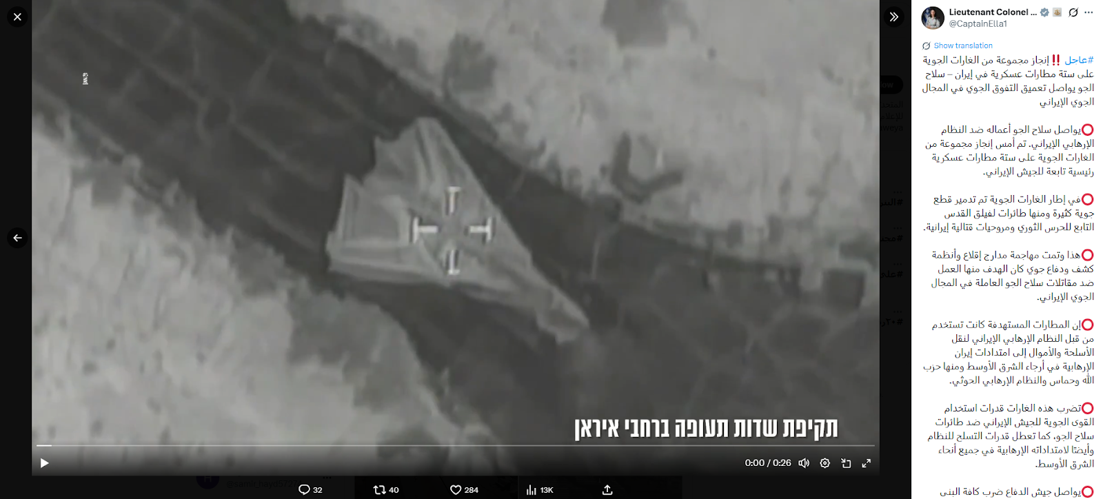 غير أن البحث العكسي عن المقطع أظهر أنه مضلل؛ إذ يتكون الفيديو من مقطعين يبلغ مجموع مدتهما 26 ثانية. ويبين التحقق أن المقطع الأول، ومدته 13 ثانية، نُشر سابقًا في 21 يونيو 2025 عبر الحسابات الرسمية لسلاح الجو الإسرائيلي وجيش الاحتلال الإسرائيلي على منصة "إكس"، حيث عُرض حينها على أنه يوثق غارات جوية استهدفت ثلاث طائرات مقاتلة من طراز F-14 تابعة للجيش الإيراني في وسط إيران. ما يعني أن هذا الجزء من الفيديو لا يرتبط بالتصعيد العسكري الأخير.