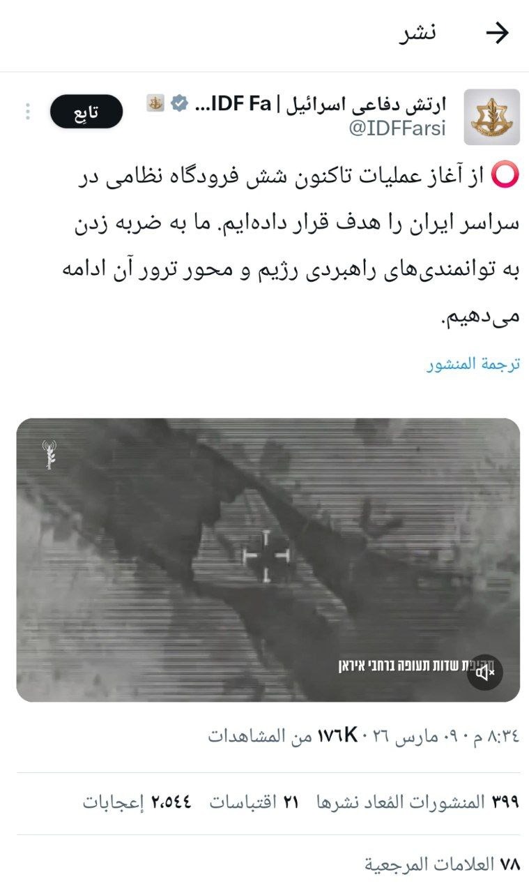 في سياق التصعيد الذي بدأته الولايات المتحدة وإسرائيل ضد إيران منذ 28 فبراير 2026، نشر جيش الاحتلال الإسرائيلي ومتحدثه عبر حساباتهم على منصة "إكس"، في 9 مارس 2026، مقطع فيديو زُعم أنه يوثق تنفيذ سلسلة من الغارات الجوية استهدفت ستة مطارات عسكرية داخل إيران، مدعين أن سلاح الجو الإسرائيلي يواصل تعزيز تفوقه الجوي في الأجواء الإيرانية.