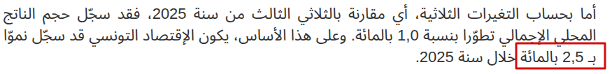 وبالعودة إلى نشرة المعهد الوطني للإحصاء حول النمو الاقتصادي للثلاثي الرابع من سنة 2025 ونشرة الوضع الطاقي لكامل سنة 2025 الصادرة عن وزارة الصناعة والطاقة والمناجم، تبين أن النمو الاقتصادي في السنة الماضية بلغ 2.5%.